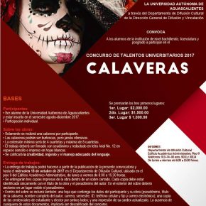 En esta ocasión, Talentos Universitarios hace la invitación para que la comunidad universitaria participe en la creación de Calaveras, una manifestación cultural mexicana que propicia la composición en verso para mostrar creatividad e ingenio en el manejo del lenguaje; por lo que se buscan propuestas con una extensión de cuatro a ocho cuartetas, entre las cuales se elegirán a los tres mejores trabajos.