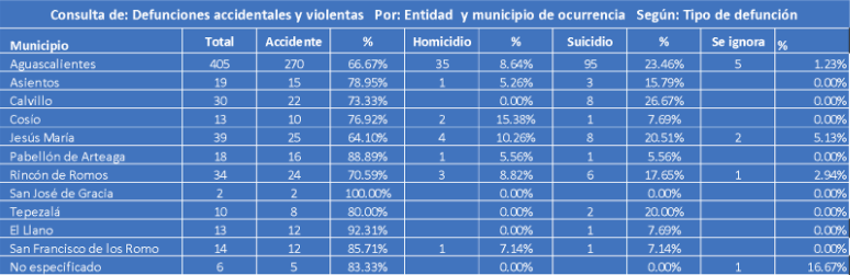A diferencia de lo que podría pensarse, los municipios con mayor tasa de muertes por accidente son los municipios extra capital y Jesús María, por lo que deben prevenirse en todo el estado; en tasa por homicidios destaca Cosío y en suicidios Calvillo; si bien la capital en números absolutos es la que, sin duda, en todo presenta más que todos los demás juntos.