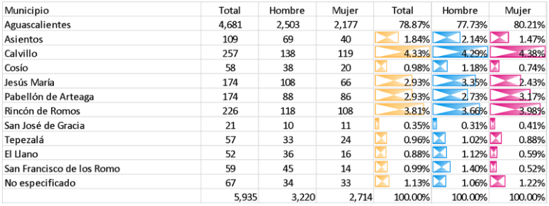 De las casi seis mil defunciones anuales, más de tres mil son masculinas; aunque, en algunos municipios por ser tan bajo el índice de masculinidad, la participación en la mortalidad femenina es mayor con relación al total. Se impone un cambio de hábitos de consumo y una mejor atención médica, para preservar a la sociedad hidrocálida de las más acechantes causas de muerte que nos aquejan.