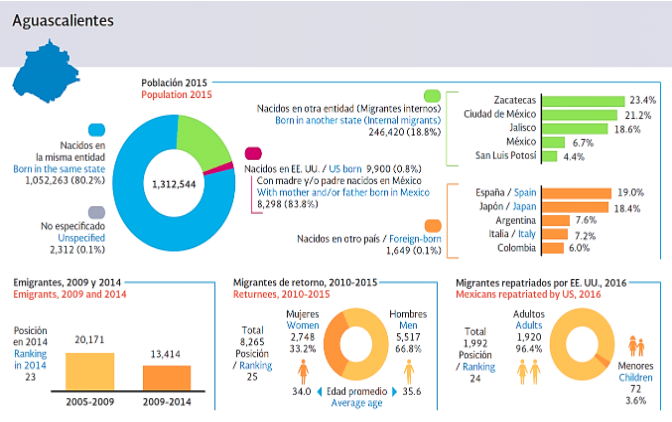 Aguascalientes, es el lugar 27 en población con el 1.1% de los habitantes del país, pero es el 23 en migrantes; 24 en migrantes repatriados, 25 en migración de retorno y 25 al participar con 1.43% de las remesas enviadas a México; porcentajes que revelan su incursión en el fenómeno migratorio. El país también está recibiendo máximos históricos en materia de divisas enviadas por migrantes, llegando el último trimestre a más de 7 mil 305 millones de dólares.