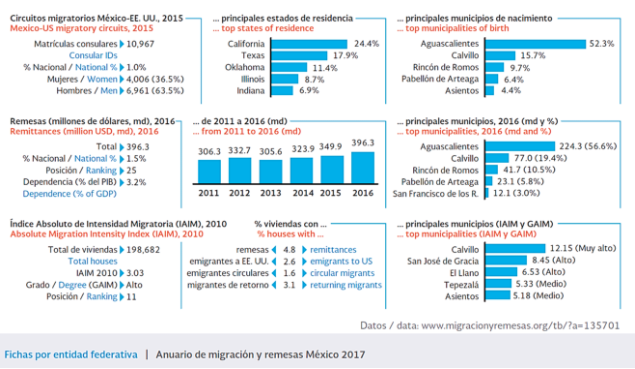Aguascalientes es origen, tránsito y destino migratorio, así se reconoce en el Anuario de Migración y Remesas, México 2017 del Conapo y BBV y cuenta con una cantidad creciente de remesas en dólares según el Banco de México.