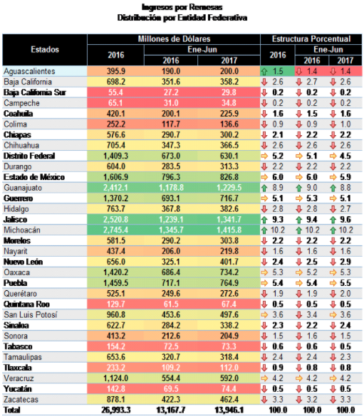 Desde el trimestre abril-junio del 2016 en Aguascalientes se han contabilizado, en promedio, más de 100 millones recibidos por las familias hidrocálidas por concepto de remesas; de abril a junio de este año se recibieron 104.54 millones de dólares, el equivalente a 1.15 MDD diarios que en la plaza se cambian por pesos y se consumen en el mercado interno a cambio de subsistencias populares.