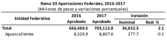 El Ramo 33, de Aportaciones Federales, representa un 41.8% de los recursos del Gasto Federalizado, pero para Aguascalientes significa el 51% del total y la cifra asciende a 8 mil 807 millones de pesos (1.25%) del recurso nacional aprobado para este ramo.