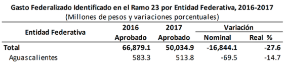 El Ramo 23 de Provisiones Salariales y Económicas, le asigna casi 514 millones a Aguascalientes, el 1.027%. Para identificar el Gasto Federalizado en el Ramo 23, por entidad federativa, se utilizan los anexos del Decreto del PEF en el año correspondiente.