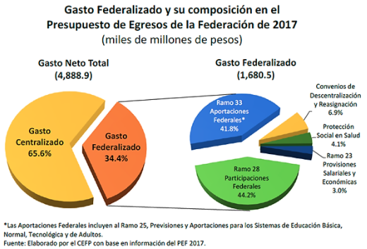 El Centro de Estudios de las Finanzas Públicas de la Cámara de Diputados publica el Gasto Federalizado, o las transferencias de recursos de la Federación a las entidades federativas, mismas que se componen principalmente del Ramo 28 de Participaciones Federales, el Ramo 33 de Aportaciones Federales, y en menor medida de los recursos identificados como Provisiones Salariales y Económicas contenidas en el Ramo 23.