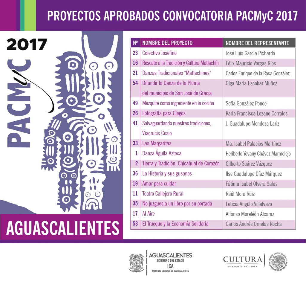 La Secretaría de Cultura del Gobierno Federal, a través del Instituto Cultural de Aguascalientes y de la Coordinación de Fondos Mixtos, anunció los 16 proyectos ganadores del Programa de Apoyo a las Culturas Municipales y Comunitarias (Pacmyc).