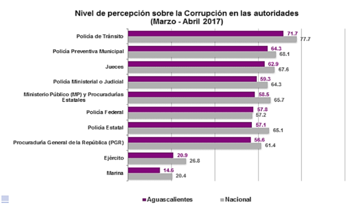 La percepción de corrupción en Aguascalientes, respecto a las autoridades de seguridad, es menor que la percibida por los mexicanos en general, pero con los mismos parámetros de confianza hacia instituciones como la marina y el ejército, en oposición a las policías locales y los jueces. Las cifras por remontar siguen siendo altas.