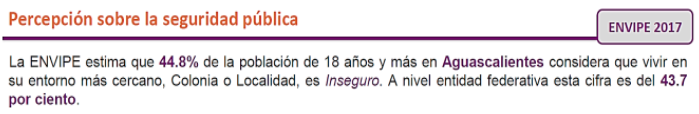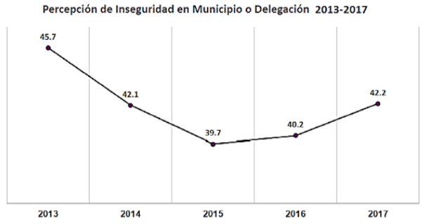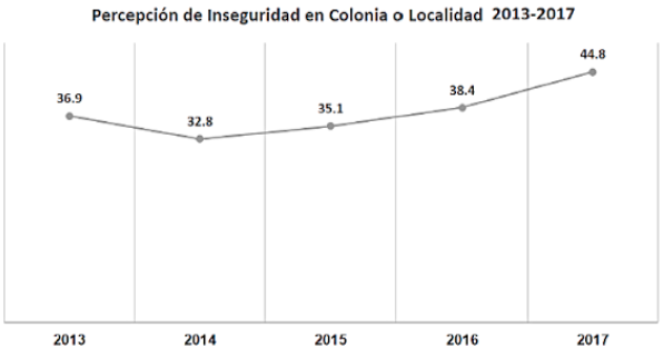 La percepción de inseguridad de la población de 18 años y más, en las entidades federativas al momento del levantamiento de la encuesta (marzo-abril 2017), se ubicó en 74.3%. Asimismo, la sensación de inseguridad en los ámbitos más próximos a las personas se ha incrementado en 2017, llegando a 66.3% y 46.0% de la población de 18 años y más que se siente insegura en su municipio o delegación y en su colonia o localidad, respectivamente.