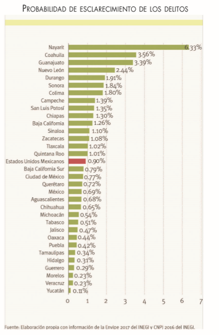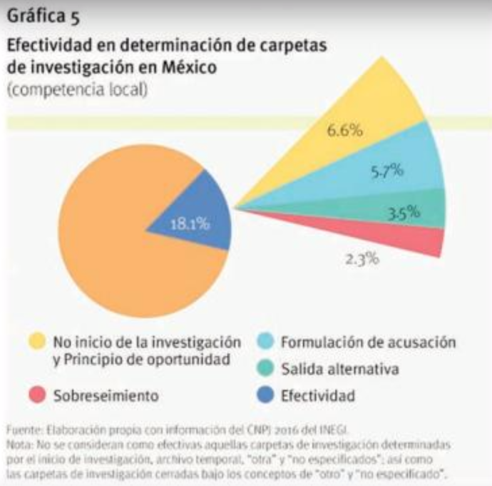 “No se puede decir que éste sea un indicador de impunidad (casos que llegan a instancia de sentencia, respecto del total de delitos cometidos), pues faltaría incorporar la probabilidad de captura (casos donde se determina al probable responsable y se obtiene una orden de aprehensión, pero que no se logra cumplimentar); que la persona sea vinculada a proceso, y que no se sobresea el caso llegando a sentencia (o se podría incluir alguna salida alternativa ya en sede judicial). Es decir, la impunidad es todavía mayor. Alrededor de un 99.5%”, se lee en el documento.