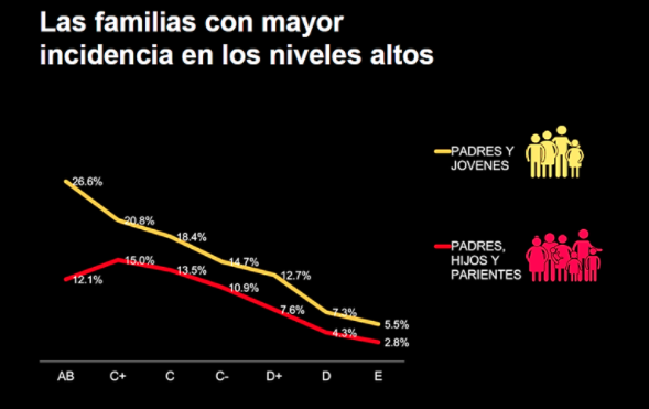 El propio Instituto de Investigaciones Sociales A.C. hace una caracterización de las familias de los diferentes niveles, ya que tienen distinta composición entre sí. Las de mayores ingresos presentan hasta un 20% adicional de padres con hijos jóvenes, y un 10% más de padres, hijos y parientes, los que podríamos describir como hogares multigeneracionales con chicos y grandes, propios de clase media y media alta.