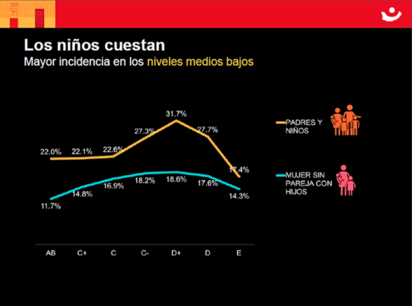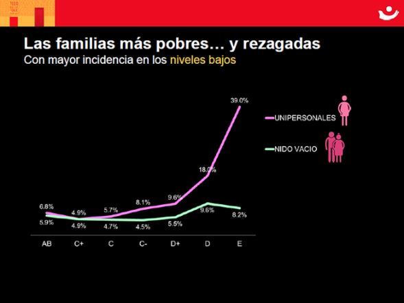 Para los niveles “D+” y “D” lo típico son hogares con padres e hijos pequeños, y en aumento, los de jefas de hogar sin pareja y con hijos; hasta la mitad de los hogares tiene este tipo de composición.