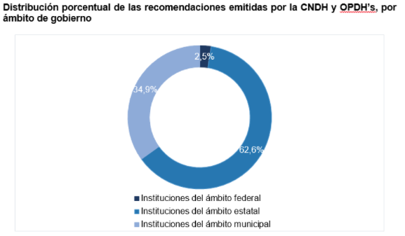 En ese mismo año, la CNDH emitió 71 recomendaciones a diferentes instituciones públicas, mientras que los OPDH emitieron un total de mil 703. Del total, 62.6% fueron para instituciones públicas del ámbito estatal, siendo las Procuradurías Generales de Justicia o Fiscalías Generales de las Entidades Federativas las autoridades que recibieron la mayor proporción (39.5%) en dicho ámbito de gobierno.