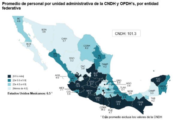 El promedio de servidores públicos por unidad administrativa, la CNDH encabeza la lista, con un aproximado de 101.3. Le siguen Ciudad de México, con 36.2 y Jalisco, con 12.0: