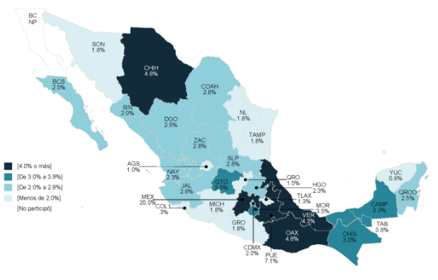 Distribución porcentual de los servidores públicos adscritos a los Congresos Estatales y Asamblea Legislativa de la Ciudad de México, por entidad federativa
