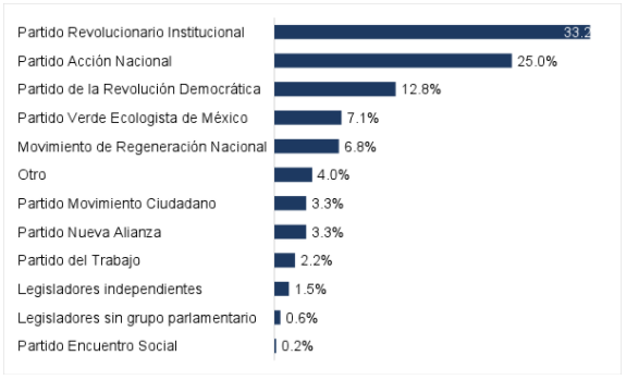 El grupo parlamentario con mayor representatividad en el ámbito nacional fue el Partido Revolucionario Institucional (PRI), con 33.2% del total de legisladores, seguido del Partido Acción Nacional (PAN), con 25.0%; y del Partido de la Revolución Democrática (PRD), con 12.8%.