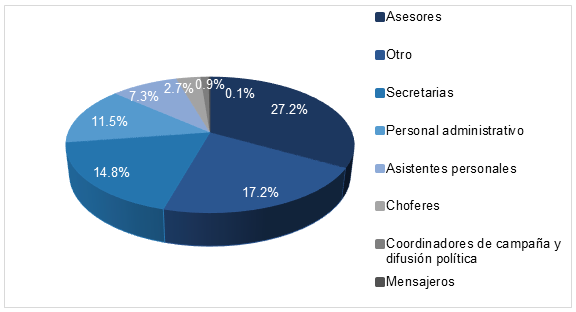 En lo que respecta al personal de apoyo con el que contaron los legisladores para el desarrollo de funciones, al cierre de 2016 se reportaron tres mil 613 personas en estos puestos, de las cuales 27.2% fueron asesores; 14.8%, secretarias; y 11.5%, personal administrativo.