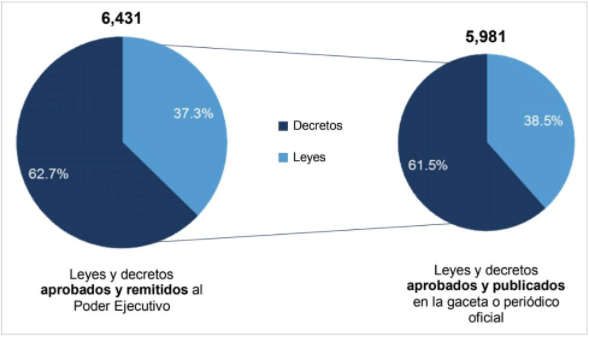 Los Congresos Estatales y Asamblea Legislativa de la Ciudad de México aprobaron y remitieron al Poder Ejecutivo de cada Entidad Federativa para su promulgación y publicación un total de 6 mil 431 leyes y decretos, de los cuales 93.0% se publicaron en la gaceta o periódico oficial de la respectiva Entidad Federativa:
