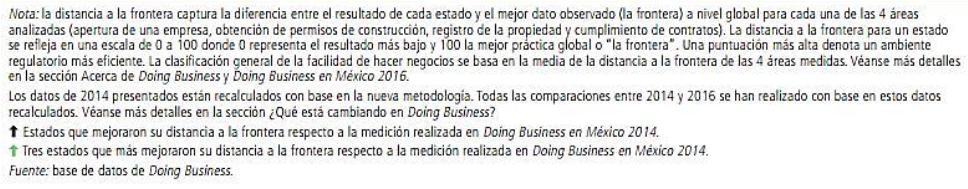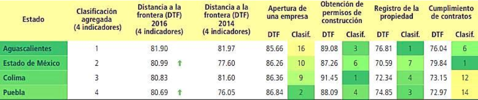 Aguascalientes, aparece en primer lugar en la lectura sub-nacional o por estados con 82 puntos. México, presenta un promedio de 75 y por debajo de las 70  unidades destaca Oaxaca como último. El Doing Business considera  para los estados cuatro indicadores clasificados de la manera siguiente: