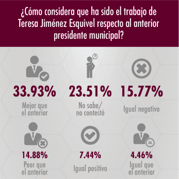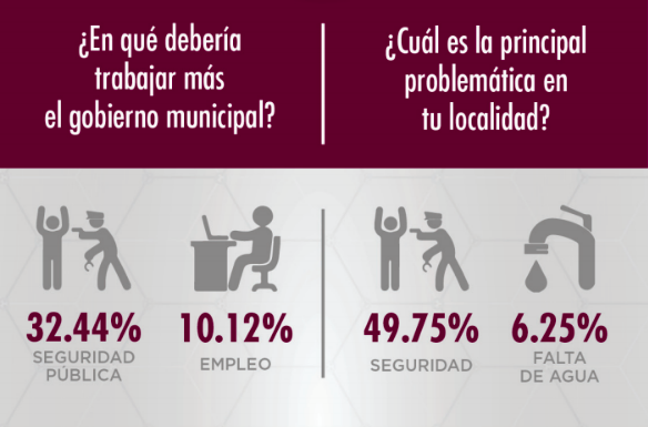 Preocupaciones. El lunes que comenzamos a difundir los resultados de la encuesta que realizó Alternativa, el primer módulo fue acerca de la calificación que se le otorga en Aguascalientes al trabajo que han desempeñado Enrique Peña Nieto, Martín Orozco Sandoval y María Teresa Jiménez Esquivel, el presidente y el gobernador fueron reprobados, mientras que la alcaldesa obtuvo una calificación de 6.72, a esa evaluación se pueden sumar la percepción que se tiene en relación con el trabajo de la presidente municipal respecto al anterior alcalde, Antonio Martín del Campo, y el 33.93% de los capitalinos considera que ha realizado un mejor trabajo, a ese tercio de los encuestados se puede agregar como positivo el 4.46% que considera que Jiménez Esquivel lo ha hecho igual que el presidente anterior. La fecha del levantamiento que realizó Alternativa fue el sábado 11 de noviembre, con entrevista cara cara en los domicilios particulares de una muestra de 400 electores que se tomó del universo de los 924,400 inscritos en la Lista Nominal de Electores, la percepción sobre el desempeño de María Teresa Jiménez recoge resultados sólo de la capital de Aguascalientes (26.79%), a quienes también se les preguntó que cuál consideraban que es el principal problema que tiene su localidad o colonia y qué debe atender el gobierno, en este caso el municipal, quitando a quienes no supieron o no contestaron (4.5%) los encuestados mencionaron 37 cuestiones, el primero de ellos la Seguridad, con 49.75% seguido de la Falta de agua (6.25%), Vigilancia (6%), Pandillerismo (4.75%), Drogadicción (4.5%), Alumbrado público (4.25%), Pavimentación (2.5%) y Recolección de basura (2.5%), el resto de las cuestiones que la población percibe que se deben atender, no rebasa el 2% cada uno. Queda claro que son dos los temas que más preocupan a la población: Seguridad y Servicios públicos, también es obvio que por la cercanía de la autoridad municipal sean en ese sentido los reclamos de atención…