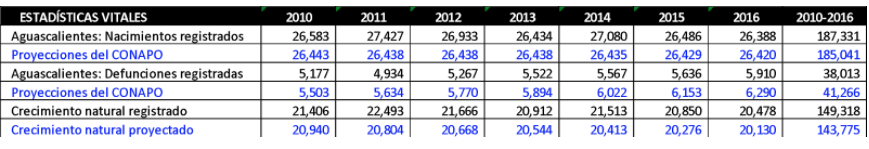 El Conapo presenta en sus proyecciones menos nacimientos y más defunciones que las registradas para Aguascalientes en los últimos años; aun así tiene un acierto del 96% en sus cálculos lo que permite considerarlos como un futurible confiable para la toma de decisiones. De hecho, el estado obtiene números mayores por estar presentando una transición demográfica tardía con respecto a la mayoría de las entidades y del propio país.