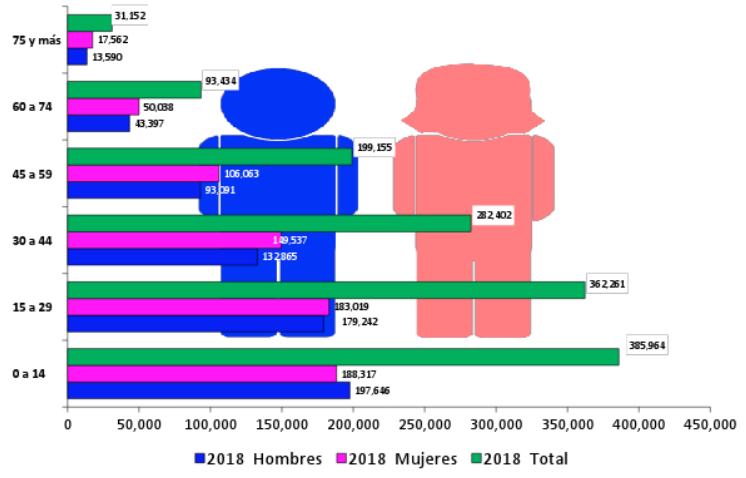 Los adultos mayores se duplicarán, pasarán de 124 mil 586 en el 2018 a más de 200 mil en el próximo 2030. El proceso de envejecimiento poblacional se aprecia en este grupo de 60 años y más, que representa la necesidad de hacer previsiones financieras, de cuidados familiares y atención a la salud, incluso de infraestructura para hacer accesible la ciudad. Solo de mujeres mayores de 60 años serán en el 2030 más de 110 mil, que era la población total de Aguascalientes hace 100 años.