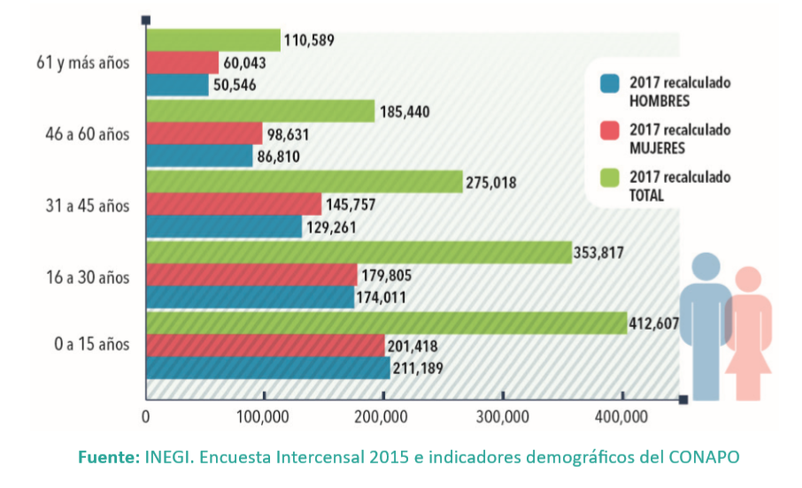 Los adultos mayores se duplicarán, pasarán de 99 mil 803 en el 2015 a 185 mil 373 en el próximo 2030. El proceso de envejecimiento poblacional se aprecia en este grupo de 61 años y más, que representa la necesidad de hacer previsiones financieras, de atención a la salud, de infraestructura para hacer accesible la ciudad. Sólo de mujeres mayores de 61 años serán en el 2030 más de 100 mil, que era la población total de Aguascalientes hace 100 años.