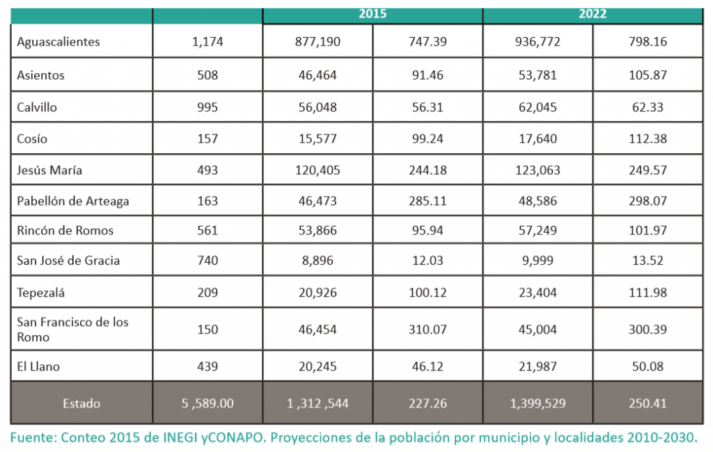 El 67.15% de la población continuará concentrada en el municipio de la capital, los municipios conurbados a la zona metropolitana de Aguascalientes (Jesús María y San Francisco de los Romo) aportaron 152 mil efectivos hasta el 2015 pero crecerá el número a 184 mil para el 2030, lo que significa que se incrementará en los próximos 15 años su participación del 15 al 16 por ciento del total de pobladores de la ZMA. Crecerá más la periferia que el centro, particularmente más allá del Tercer Anillo.