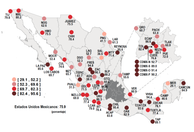 Nota: Los porcentajes refieren a la población de 18 años y más residentes en las ciudades de interés, según su percepción sobre la efectividad que el gobierno de su ciudad tiene para resolver los problemas más importantes. Excluye la opción de respuesta “No sabe o no responde”. Incluye las opciones de respuesta “Muy efectivo” y “Algo efectivo”.