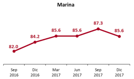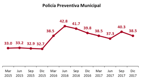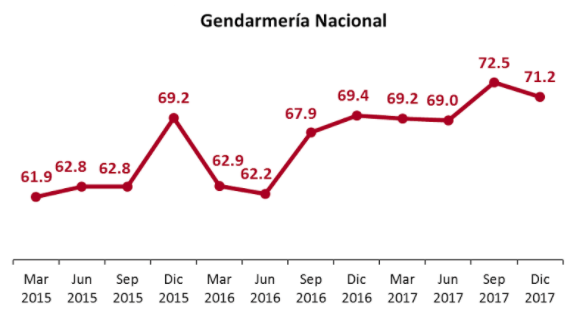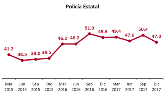 Sobre el desempeño de las policías Preventiva Municipal, Estatal, Federal, Gendarmería Nacional, Ejército y Marina, para prevenir y combatir la delincuencia, destaca que los porcentajes de la población de 18 años y más que identificó a las diversas corporaciones policiales y que percibió su desempeño como “muy o algo efectivo” en sus labores para prevenir y combatir la delincuencia fueron: Marina (85.6%), Ejército (83.2%), Gendarmería Nacional (71.2%), Policía Federal (65.3%), Policía Estatal (47%) y Policía Preventiva Municipal (38.5%); sólo la Policía Federal “mejoró” en la percepción de la población, al pasar de 65.0 a 65.3, mientras que el resto de las corporaciones mostraron porcentajes en descenso.