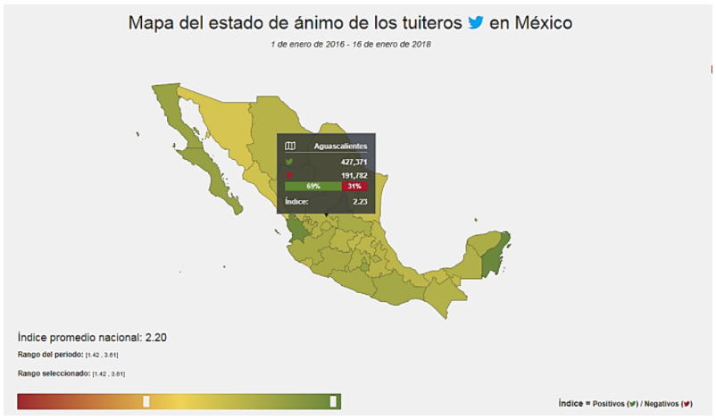 Así, el Estado de Ánimo de los Tuiteros en México reporta un cociente de positividad a partir de enero de 2016 con actualización automática diaria, que puede ser visualizado para el país en su conjunto y para cada una de sus entidades federativas con frecuencia anual, trimestral, mensual, semanal, diaria e incluso por hora.