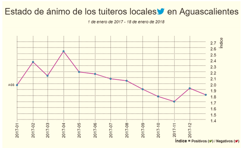 En 24 meses (de enero del 2016 a enero del 2018) se analizaron para Aguascalientes 619 mil 153 tuits, de los cuales, 69% fueron de carácter positivo por 31% de registro negativo. Aunque presenta un comportamiento a la baja, semejante al nacional, Aguascalientes tiene en el histórico un balance de 2.23 veces más positivos que negativos, superando a la media nacional de 2.2 veces. En las lecturas 2018 más recientes, no se superan los 2 puntos del índice en los escenarios local y nacional.