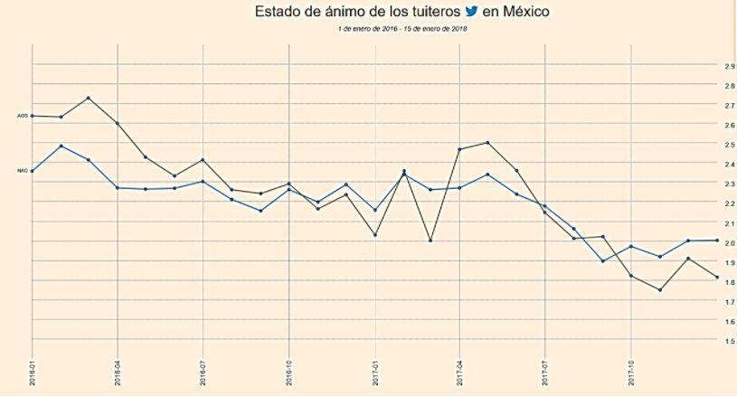 El Inegi afirma estar incursionando en el mundo del Big Data, explorando la utilidad de fuentes no tradicionales de información, a fin de vincularlas con la generación de información estadística y geográfica que nos presente el estado de ánimo en México y en Aguascalientes. Se trata de un trabajo experimental que tiene por objetivo el de interpretar la emotividad que subyace en los mensajes que se publican en la plataforma digital Twitter.