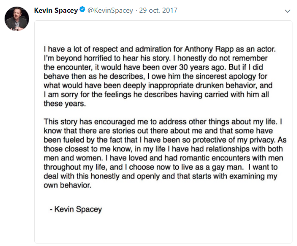 La respuesta de Kevin Spacey fue dolorosa (vía Twitter, @kevinspacey ) es su último tuit, en relación con las acusaciones de Anthony Rapp, dijo no recordar el hecho, explicó que si había sucedido pudo ser producto de “una terriblemente inapropiada conducta alcoholizada”, lo peor es que antes de disculparse como aconsejan los protocolos, intentó desviar la atención hacia otro asunto: “Como mis más allegados saben, en mi vida he tenido relaciones tanto con hombres como con mujeres. He amado y he tenido encuentros románticos con hombres a lo largo de mi vida, y ahora elijo vivir como un hombre gay.”
