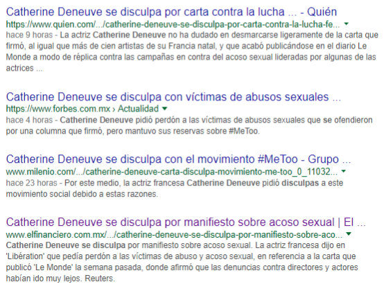 La supuesta disculpa de Catherine Deneuve es el cierre de la carta: “Soy una mujer libre. Y seguiré siéndolo. Saludo fraternalmente a todas las víctimas de actos odiosos que pudieron sentirse ofendidas por nuestro publicado en Le Monde. A todas ellas presento mis excusas”, la presentación de la carta en los medios, a esa supuesta disculpa, se le han quitado todos los matices. Seguramente quienes editan las notas no les parecen atractivas las precisiones, no funcionan como leña para el efímero, lamentable y poco productivo “debate” entre feministas buenas y malas. De hecho, se hace de lado una de las partes centrales de la carta, la que clarifica el problema de fondo: “Firmé nuestra petición por una razón esencial, a mi modo de ver: los peligros que se ciernen sobre las artes, la creación. ¿Vamos a quemar a Sade en la edición de la Pléiade? ¿Vamos a denunciar a Leonardo da Vinci como artista pedófilo y destruir sus obras? ¿Vamos a descolgar a Gauguin de nuestros museos, o destruir los dibujos de Egon Schiele? ¿Vamos a prohibir los discos de Phil Spector? Ese clima de censura me deja muda y me inquieta por el futuro de nuestras sociedades”.