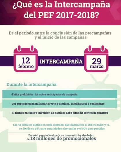 El Instituto Nacional Electoral (INE) informa que luego de 60 días de precampañas, este lunes da inicio el periodo de intercampañas, en las que los precandidatos no pueden hacer eventos públicos, llamar al voto ciudadano ni aparecer en los spots de sus partidos.