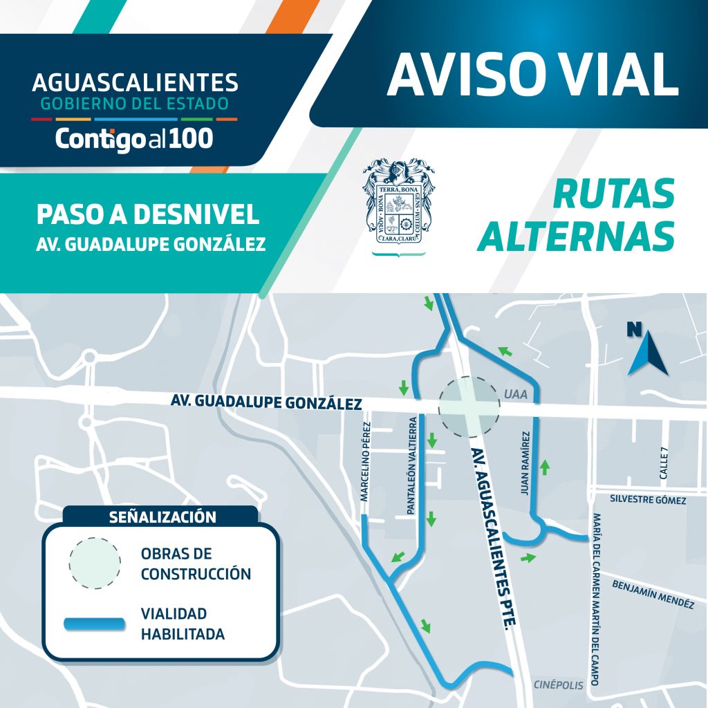 La Secretaría de Obras Públicas del Estado informa a la población en general, que a partir de hoy 1 de febrero entra en funciones el circuito vial acondicionado por las obras de construcción del paso a desnivel de avenida Aguascalientes en su cruce con avenida. Guadalupe González.