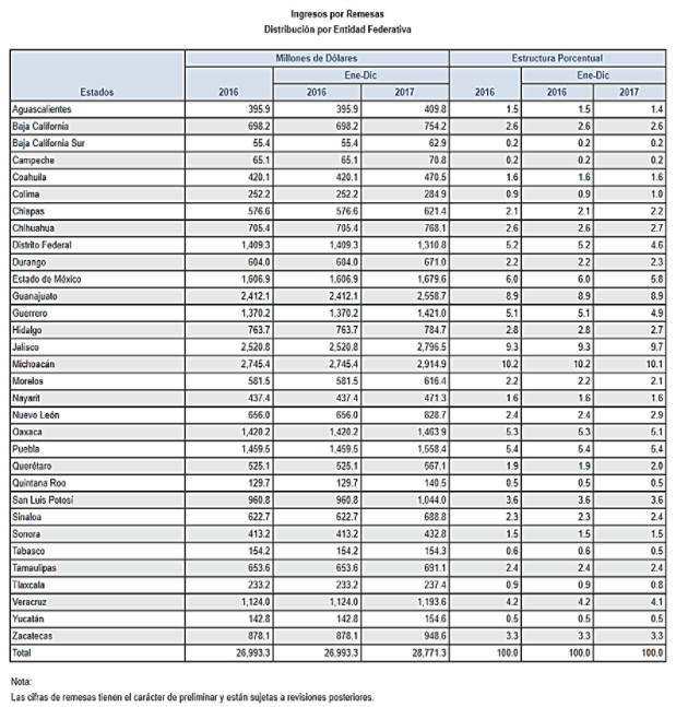 Así como el país, Aguascalientes recibió el monto más alto en remesas de su historia, en un año y para un trimestre durante el pasado 2017. En total anual acumuló 409.814 millones de dólares en remesas familiares, equivalentes a un promedio de 1.12 millones de dólares diarios de acuerdo con datos de Banxico dado a conocer por estado, y el último trimestre octubre–diciembre, del mismo año pasado, las familias recibieron 105.12 millones de USD, la cifra más alta en un trimestre para la entidad.