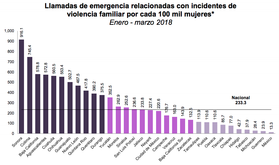 El estado también tiene la cuarta tasa más alta de emergencias por violencia de pareja por cada cien mil habitantes con mil 644 en total y un promedio diario de 18 casos de maltrato físico, sexual o emocional y comportamientos controladores cometidos por un compañero íntimo. Lo superan Baja California, Quintana Roo y Chihuahua.