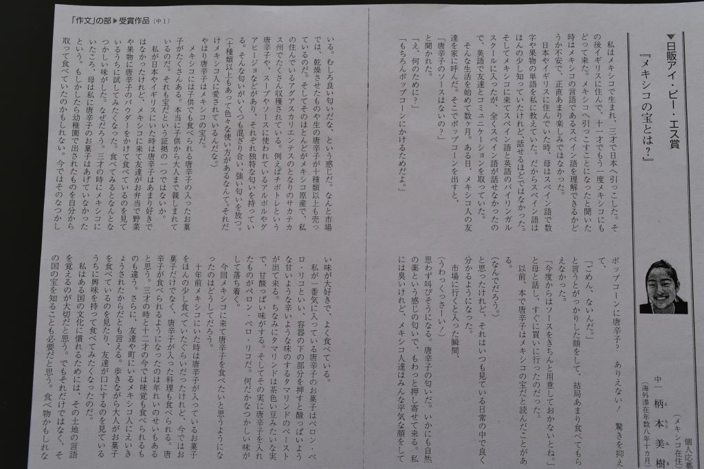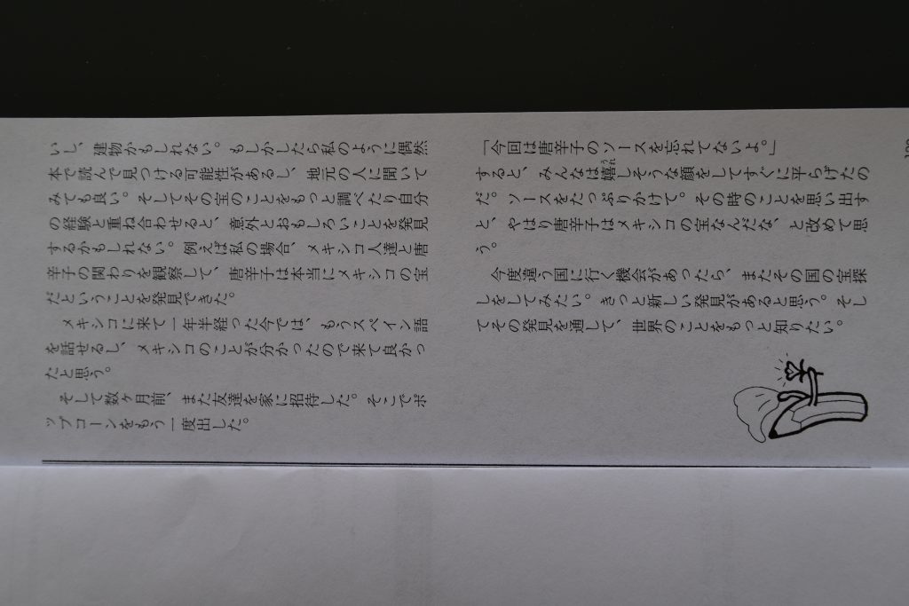 El texto que se presenta en esta columna pertenece a Miki Emoto, una japonesa de 14 años que actualmente estudia en Aguascalientes. Miki participó en un concurso de redacción en Japón en donde presenta experiencias que ha tenido de vivir en México; ella observa, especialmente, la apreciación que los mexicanos tenemos por la comida picante y el chile en general. De entre más de 4 mil 800 textos que niños escribieron de diferentes partes del mundo, en diferentes idiomas, Miki obtuvo el Séptimo lugar. El texto fue redactado por ella tanto en español como en japonés y más allá de ser una práctica del lenguaje, es una oportunidad de descubrir cómo nos ven los demás, los que vienen de otros países, “del otro lado del mundo”.