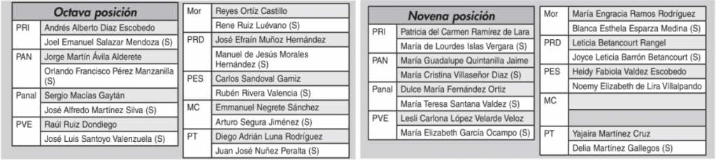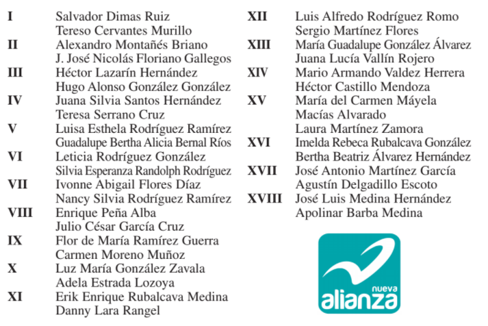 En las listas registradas hay algunos candidatos que hacen todo lo posible por asegurarse un lugar en el Congreso local, como en Nueva Alianza María del Carmen Mayela Macías Alvarado y Mario Armando Valdez Herrera, quienes además de hacer campaña por los distritos XV y XIV, se apuntaron en la lista de diputados por representación proporcional, el exdirigente de la sección 1 del SNTE en la primera posición y la diputada que busca su reelección en la cuarta posición.