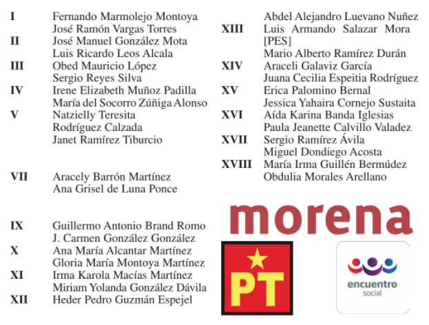 La coalición Juntos Haremos Historia presenta ciertas “anomalías”, pues en los distritos VI y VIII se registraron candidatos por el Partido del Trabajo y por Encuentro Social. En el VI competirán Karen Berenice Salas Molina (PT) y Anahis del Rocío Martínez Domínguez (ES); y en el VIII Raúl González Reyes (PT) y Alejandro Américo Landín Luévano (ES).