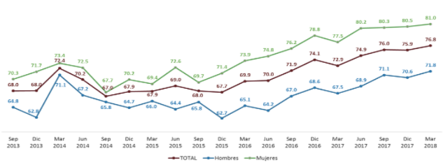 En el ámbito nacional, este porcentaje no representa un cambio significativo1 respecto a diciembre de 2017, pero sí es estadísticamente mayor al registrado en marzo de 2017. La percepción de inseguridad siguió siendo mayor en el caso de las mujeres con 81.0%, mientras que para los hombres fue de 71.8 por ciento.