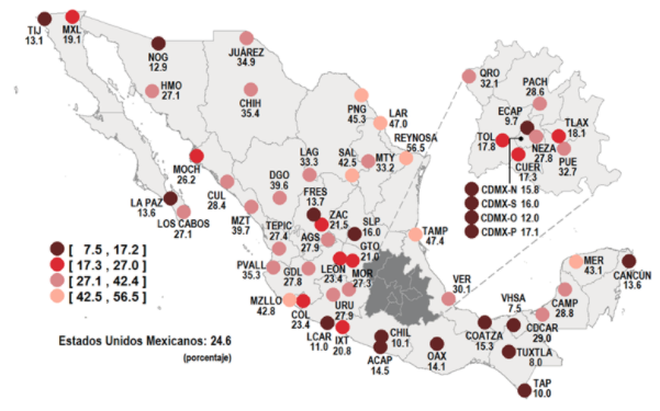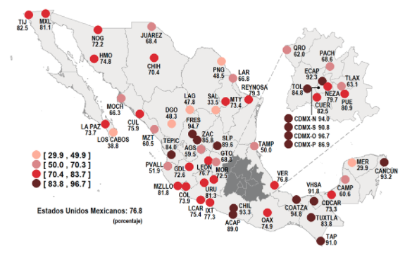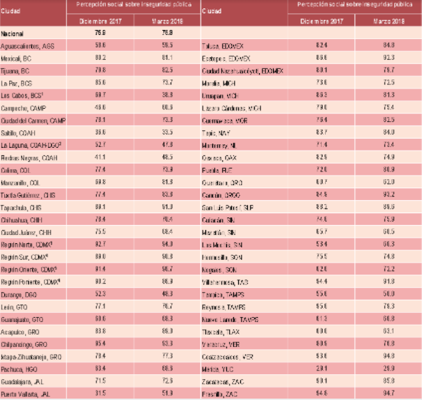 Mientras que las ciudades con menor percepción de inseguridad fueron: Mérida, Saltillo, Los Cabos4, La Laguna5, Durango y Piedras Negras con 29.9, 33.5, 38.8, 47.8, 48.3 y 48.5%, respectivamente.