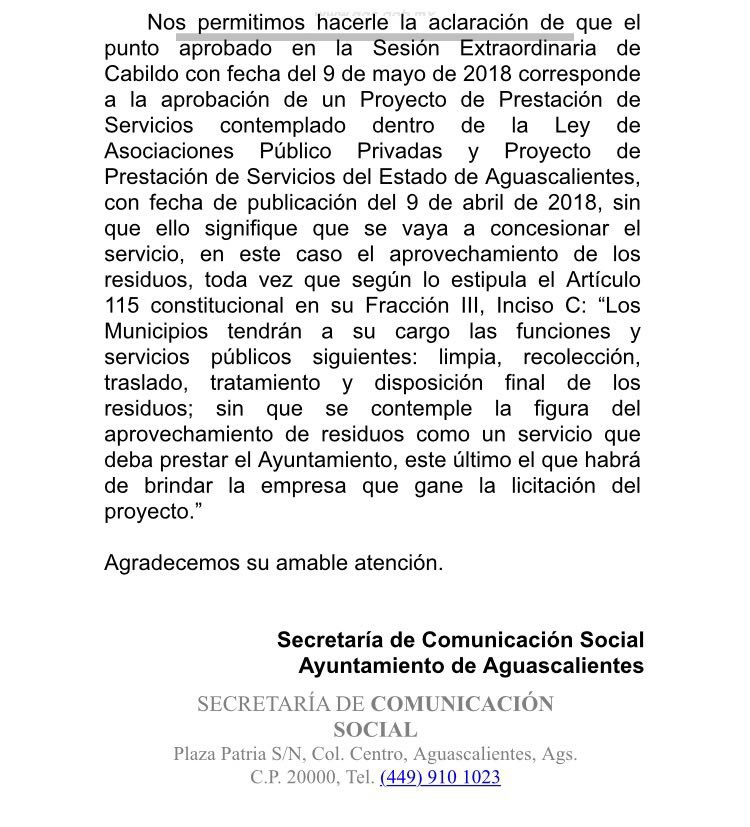 Luego de que se aprobó el Proyecto del Centro Integral de Valorización de Residuos Sólidos Urbanos en el Cabildo, se espera que próximamente pase a manos del Congreso del Estado donde se habrán de analizar los términos legales a los que se atiene esta Asociación Pública Privada, toda vez que, por ejemplo, en el Plan de Desarrollo Municipal se contempla la construcción de este centro, no se estipula que se opere bajo este esquema.