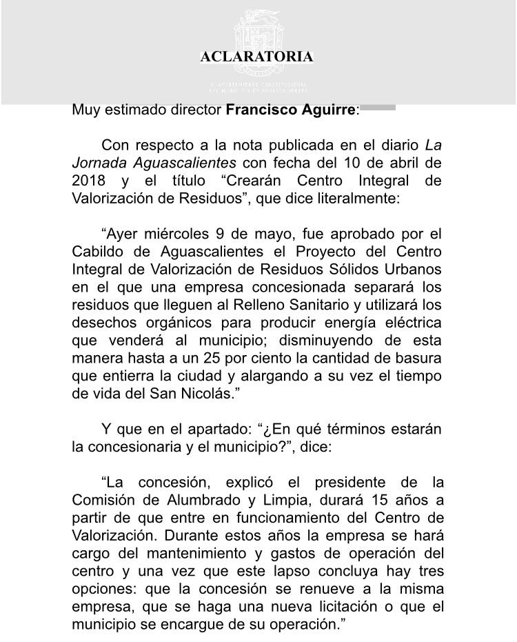 Ayer miércoles 9 de mayo, fue aprobado por el Cabildo de Aguascalientes el Proyecto del Centro Integral de Valorización de Residuos Sólidos Urbanos en el que una empresa concesionada separará los residuos que lleguen al Relleno Sanitario y utilizará los desechos orgánicos para producir energía eléctrica que venderá al municipio; disminuyendo de esta manera hasta a un 25 por ciento la cantidad de basura que entierra la ciudad y alargando a su vez el tiempo de vida del San Nicolás.