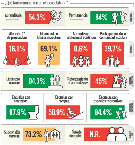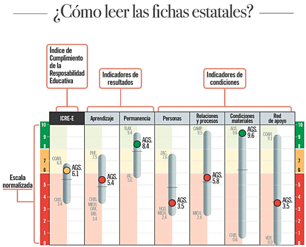 Para Mexicanos Primero, el Índice de Cumplimiento de la Responsabilidad Educativa (ICRE) Estatal 2018, arroja que Aguascalientes, califica en 9° lugar con 6.1 de calificación; las entidades líderes son Coahuila y la Ciudad de México con 6.8, seguidas de Puebla y Tlaxcala con 6.5; entre los vecinos Zacatecas se encuentra en el 7° lugar con un 6.2.