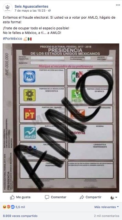 En redes sociales circula una imagen que sugiere que para votar por López Obrador es necesario marcar toda la boleta. Esta información es falsa, pues esto implicaría un voto nulo.