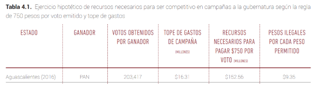En el ejercicio hipotético de recursos necesarios para ser competitivo en campaña a la gubernatura, estimando que cada voto cuesta 750 pesos y de acuerdo al tope de campaña (16 millones), un estimado del estudio indica que en Aguascalientes, por cada peso permitido por el tope de campaña, se gastaron 9.35 pesos ilegales en la entidad.
