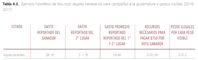 “Esta brecha entre lo que se puede gastar y lo que se gasta es enorme. La disparidad es aún mayor si se comparan los gastos que reportan los partidos y lo que gastan en realidad. Según los informes de fiscalización del INE, los partidos y los candidatos gastan en promedio tan sólo 32.8% del tope legal; con base en dicha información, en promedio, por cada peso reportado hay 15.3 pesos de financiamiento ilegal”, el estudio incluye un ejercicio hipotético de los recursos ilegales necesarios para campañas a la gubernatura y los gastos visibles, establece que por cada peso visible se emplearon 15.30 pesos ilegales, esta cantidad se obtiene del gasto promedio 9.98 reportado por los candidatos que quedaron en primer y segundo lugar (8.19 y 11.76) restado a los recursos necesarios para pagar el voto ganador (152.56).