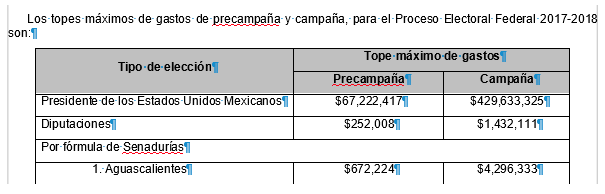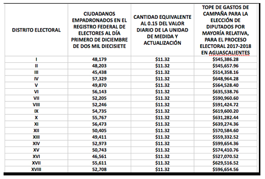 El tope por elector para elegir presidente de la República sería de alrededor de 5 pesos, mientras que en Aguascalientes el tope por elector para elegir gobernador en la elección pasada fue de 18.21, lo que se obtiene dividiendo el Tope de gastos de campaña a gobernador (16,308,517.28 ) entre la lista nominal por estado para la última elección antes de 2018 (Lista nominal 2016: 895,189).
